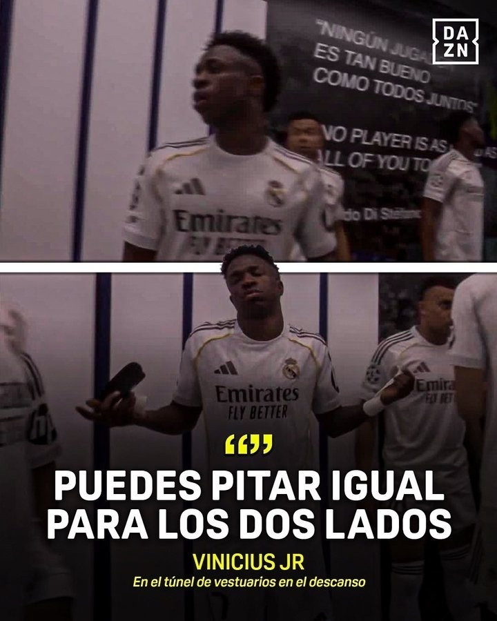 这也让巴西巨星相等不悦,据悉,维尼修斯被录像机捕捉到在中场休息的球员通谈时向裁判挟恨:“你应该对两支球队进行公正吹罚。”