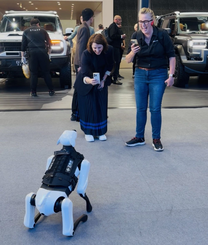 相似招引眼球的,还有机器狗和机器东说念主。尽管它们如今也曾成为各大展会的常驻嘉宾,但对于番邦东说念主来说依旧新奇。北京车展的机器狗就引来许多番邦东说念主打卡拍照,别称番邦女士弯下腰跟机器狗发出号令说,“Sit(坐)。”机器狗听话地坐下,她的伙伴在傍边给她和机器狗拍视频。