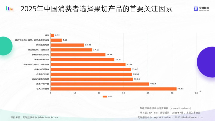 数据显现,2025年中国花消者选用果切居品的要害矜恤身分中,个东谈主口味喜好占比最高为51.83%;其次是生果种类丰富,占40.54%;商品的摆盘和包装位列第三,占33.86%。艾媒研究分析师以为,花消者对果切的矜恤中枢聚焦个东谈主需求(口味、种类)与居品体验(摆盘包装),价钱(33.55%)、崭新度(33.07%)等身分有一定影响,但个性化与居品呈现是要津运转,连锁品牌、操作法度等非中枢身分占比相对较低。