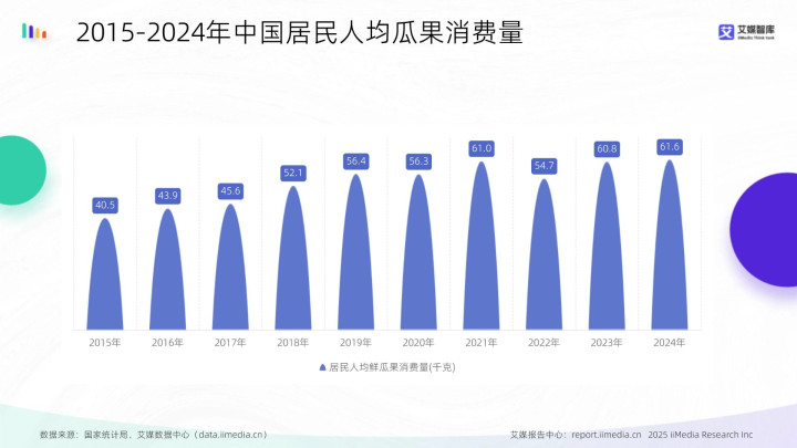 数据显现,2015-2021年住户东谈主均鲜瓜果花消量由40.5千克握续增长至61.0千克,2022年窄小回落至54.7千克后,2023-2024年速即还原至60.8千克、61.6千克,举座呈现安稳高涨态势。艾媒研究分析师以为,鲜瓜果花消量频年举座呈增长趋势,时辰虽有短期波动,但花消畛域已结识晋升至较高水平。这响应了住户生果花消需求的握续增强与花消民风的长远,为果切市集提供了坚实的需求基础,预示着该细分领域具备精湛的发展出息。