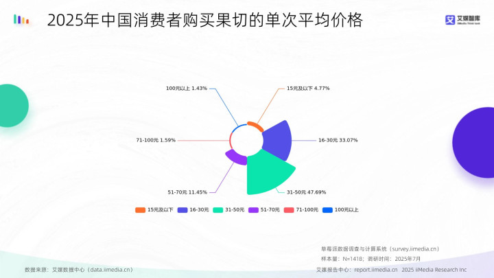 数据显现,2025年中国花消者购买果切的单次平均价钱中,31-50元占比最高为47.69%,16-30元次之占33.07%,51-70元位列第三(11.45%)。艾媒研究分析师以为,果切花消价钱高度汇聚于16-70元区间,其中31-50元成为主力价钱带,响应出花消者对崭新、肤浅果切居品已酿成牢固的品性付费意愿。中端价钱主导、两头占比偏低的结构特征,标明果切市集正缓缓建树与其处事属性相匹配的订价体系。