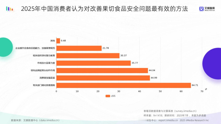 数据显现,关联部门细化排查步骤是花消者以为改善果切食物安全最灵验的方法,占比64.71%;花消者加强监督次之,占44.99%;发轫品牌起带头标杆作用位列第三,占44.04%。艾媒研究分析师以为,花消者对果切食物安全改善的期待汇聚在监管细化、本身参与及品牌引颈,这响应出在食物安全领域,公众仍高度依赖并信任政府监管的泰斗性与奉行力,视其为最奏凯灵验的保险。同期,这也对监管的主动性、清雅度与透明度提议了更高条目,突显了强化轨制性敛迹的要津作用。