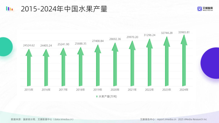 数据显现,2015年至2024年,生果产量从24524.62万吨稳步高涨至33965.81万吨,年均保握增长态势。艾媒研究分析师以为,农居品供给才气的握续增强,为卑劣加工要领提供了牢固且充裕的原料基础。果切行业可依托该趋势,进一步保险原料供应牢固,缩小采购波动风险,同期适合花消市集对崭新、肤浅果品的需求,撑握行业畛域化与高质料发展。
