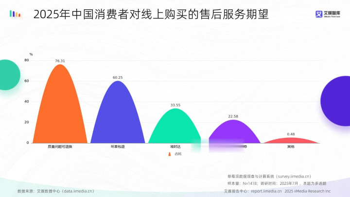 数据显现,2025年中国花消者对线上购买售后处事的盼望中,质料问题可休养占比最高,达76.31%;其次是坏果包退,占60.25%;准时达位列第三,占33.55%。艾媒研究分析师以为,花消者对线上售后的中枢盼望汇聚在基础职权保险(质料休养、坏果包退)及践约时效性(准时达),证明用户最矜恤售后的实用性与可靠性,基础处事也曾平台晋升称心度的要津。