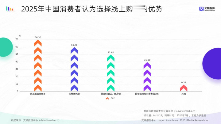 2025年中国花消者以为选用线上购买的上风