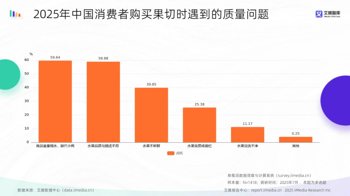 数据显现,2025年中国花消者购买果切时遭逢的质料问题中,商品分量缩水、缺斤少两占比最高为59.64%,其次是生果品性与容颜不符达58.88%,第三是生果不崭新占39.85%。艾媒研究分析师以为,花消者购买果切的质料问题汇聚在计量准确性、品性一致性及崭新度上,分量缩水和品性不符是最杰出痛点,响应果切行业需强化计量管制与品性管控,晋升崭新度保险才气以匹配花消者需求。