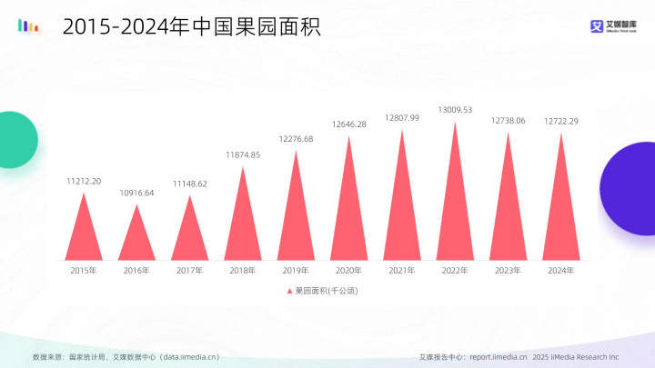 数据显现,2015-2024年中国果园面积总体呈波动高涨态势,从2015年的11212.20千公顷增多至2022年的13009.53千公顷,达到时辰峰值,随后两年小幅回落,2024年为12722.29千公顷。艾媒研究分析师以为,生果原料供应的基本盘保握结识且有所拓展,为卑劣加工要领提供了较为弥散的资源保险。原料供给总量的稳步晋升与高位企稳,有助于撑握果切行业握续优化供应链布局,强化居品牢固输出才气。