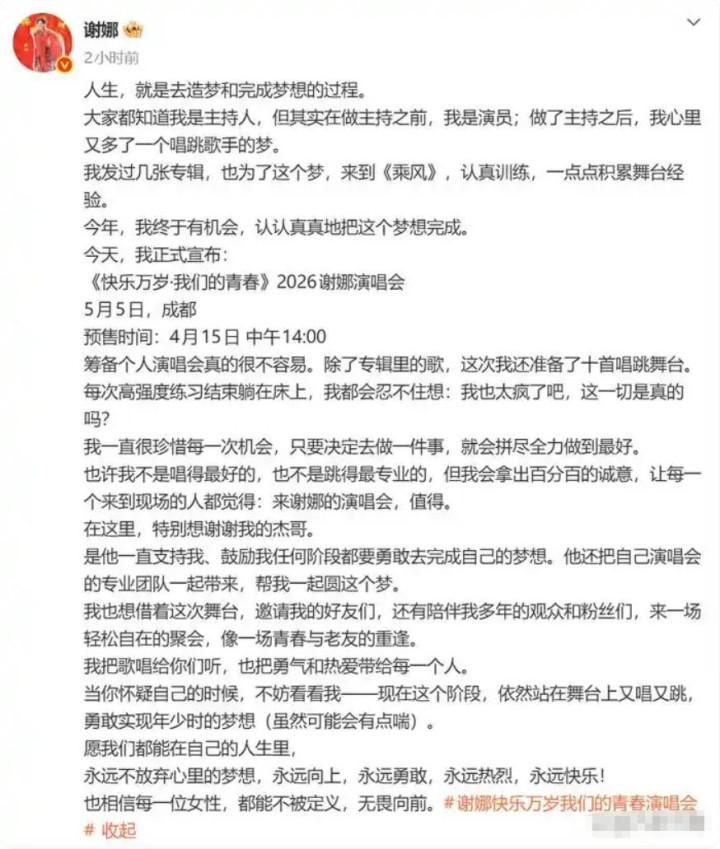 4月11日,在《乘风2026》的现场,谢娜官宣了我方要在5月5日举办演唱会。